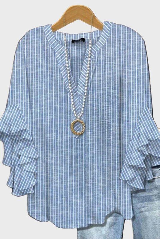 Nora | Silhuet Blå hæver den klassiske stil med rolig, tidsløs elegance. Den blå bund med hvide lodrette striber fremhæver et minimalistisk snit, der taler til det raffinerede i dig. Den delikate volang på ærmerne tilføjer bevægelse og femininitet uden at overdrive. Hver detalje antyder omhyggeligt håndværk og en gennemført finish, som gør toppen til et alsidigt investeringsvalg for garderoben. Designet til at holde formen gennem sæsonerne, mens den afslappede pasform lover komfort hele dagen.