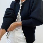 Farah | Cardigan udtrykker håndværkets arv gennem ren enkelhed og materialekvalitet. Den cropped pasform fremhæver taljen, mens fuldlange ermer og ribkantede manchetter skaber en stram, veldefineret silhuet. Den runde hals med perleknapper tilfører en diskret, festlig finish, der gør cardiganen alsidig fra hverdags- til aftenslook. Delikate rå kanter langs nederkant og ærmer giver moderne kontrast til de klassiske detaljer. Den bevidste begrænsede produktion øger luksus og giver Farah langtidsholdbar samlerværdi, der udvikler sig med tiden.