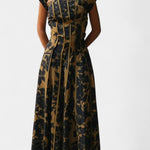 Gylden | Maxi-kjole er en udsøgt fejring af håndværk og arv. Den fletter retroinspireret elegance med moderne finesse gennem et gennemarbejdet snit og et mønster, der udstråler eksklusivitet. Det gyldne vintage-kprint på sort baggrund skaber en kunstnerisk atmosfære og afspejler mærkets forpligtelse til kvalitet. Den ærmeløse silhuet og maxi-længden giver bevægelsesfrihed og en tidløs, raffineret linje. Kjolen er tilgængelig i begrænset antal og bærer en diskret luksus samt en stærk samlerappel, der varer ved.