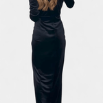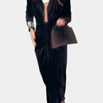 Luna | Fløjl kjole er et mesterværk i fløjl, skabt til dem, der værdsætter tidløs elegance og raffineret håndværk. Den dybe V-udskæring, lange ærmer og frontsplit skaber en sofistikeret silhuet, mens den gyldne finish tilfører et diskret, luksuriøs præg. Bevidst håndværk og materialekvalitet giver kjolen et smidigt fald og en tidløs glans, der kan bæres igen og igen uden at tabe karakter. Begrænsede antal øgede eksklusivitet og samlerværdier og gør Luna særligt attraktiv for dem, der værdsætter forskellige værdier frem for kortvarige trends. Ideel til galaer og særlige aftener, hvor du ønsker at være centrum for opmærksomheden uden prætentiøsitet. Luna lover tidløs elegance og lang levetid.