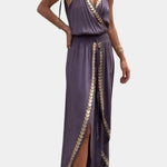 - Signaturdetaljer: krydset halsudskæring og åben ryg, der rammer décolletage og rygparti med elegance.