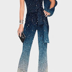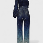 Katrine | Asymmetrisk jumpsuit tilføjer tidløs glamour til hver bevægelse. Den asymmetriske konstruktion, den skinnende overflade og den drømmende farvegradient fanger lyset og gør plagget til aftenens midtpunkt. Håndværket bærer præg af omhyggelig detaljrigdom, hvor sømme og finish udføres af erfarne mestre, der værner om tradition og kvalitetskrav. Produceret i begrænset antal hos et anerkendt atelier understreger Katrines herkomst og giver stærk samlerværdi. Den asymmetriske skulderdesign med én ærme og den tidløse silhuet samt det flydende bukseparti skaber en lang, elegant linje.