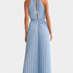 Patrizia | Heldragt udstråler arkitektonisk minimalisme og håndværksmæssig præcision. Med rene linjer, draperede læg og en halterneck fremstår den tidløs og sofistikeret – ideel til begivenheder, hvor stil taler for sig selv. Det plisserede stof tilfører tekstur, lethed og bevægelse, mens Palazzo-snittet flatterer kroppen. Begrænset produktion gør den særligt eksklusiv og kollektoratraktiv, en investering i tidløs kvalitet og arv. Patrizia giver en moderne, diskret luksus til bryllupper, sommerfester og andre begivenheder, hvor silhuetten står i centrum.