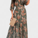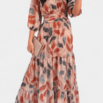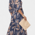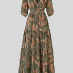 Aïsha Maxi-kjole udstråler tidsløs elegance gennem et let bladmønster og et snit, der smigrer naturligt. Den dybe V-udskæring, løse ærmer og en markant talje skaber en sofistikeret silhuet uden anstrengelse. Designet ærer en lang tradition for håndværk og omtanke i hvert snit, og den begrænsede produktion gør kjolen til en investering i tidløs kvalitet og en ægte samlergenstand i garderoben.