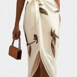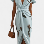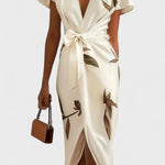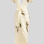 Dhalia Midikjole fra Vibeke repræsenterer en tidløs signatur i elegant design. Den raffinerede silhuet følger kroppen gennem en kendetegnende wrap-form og en flatterende V-hals, der giver bevægelsen lethed og stil. Bladmotiv i naturlig tone pryder stoffet og tilfører en moderne, sofistikeret ånd. Hver detalje vidner om omhyggeligt håndværk og arv, mens den begrænsede produktion signalerer eksklusivitet uden at virke overdrevet. Satinagtigt stof giver en diskret glans og en silkeblød fornemmelse mod huden, mens wrap-konstruktionen smigrer taljen og fremhæver décolleté med tidløs finesse.