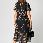 Inger | V-hals kjolen er en håndværksmæssigt udført kreation, der forener tidløs elegance med skånsom komfort. Den sorte stofbund med gyldne detaljer giver et diskret, raffineret udtryk til enhver lejlighed. Det lette, luftige snit falder smukt omkring kroppen og skaber komfort hele dagen, mens de gennemarbejdede mønstre tilføjer et strejf af luksus uden at overskyde enkelheden. Med begrænset tilgængelighed står kjolen som et tidsløst investeringskøb, der bærer arv og omtanke.