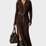 Det lange, figursyede snit og det justerbare taljebælte fremhæver kroppens form og skaber en elegant silhuet, der bevæger sig let og yndefuldt.