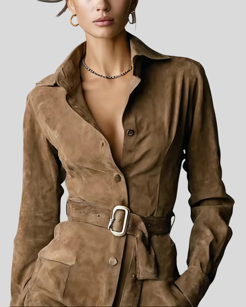 Snit, der fremhæver figuren – det justerbare bælte markerer taljen og forlænger silhuetten visuelt.