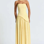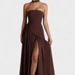 - Bevægelse og silhuet – Off-shoulder-modelens struktur fremhæver silhuetten med en asymmetrisk talje og draperet, fuldt langskørt med høj splits for naturlig bevægelse.