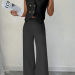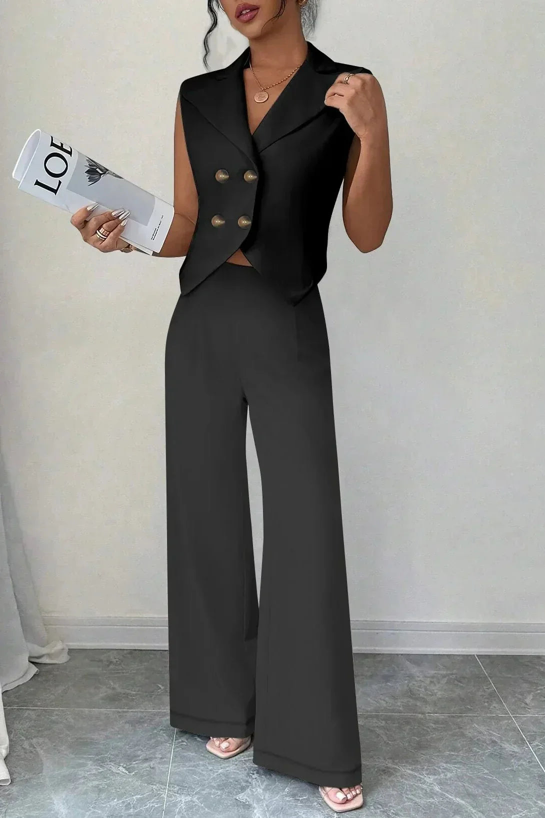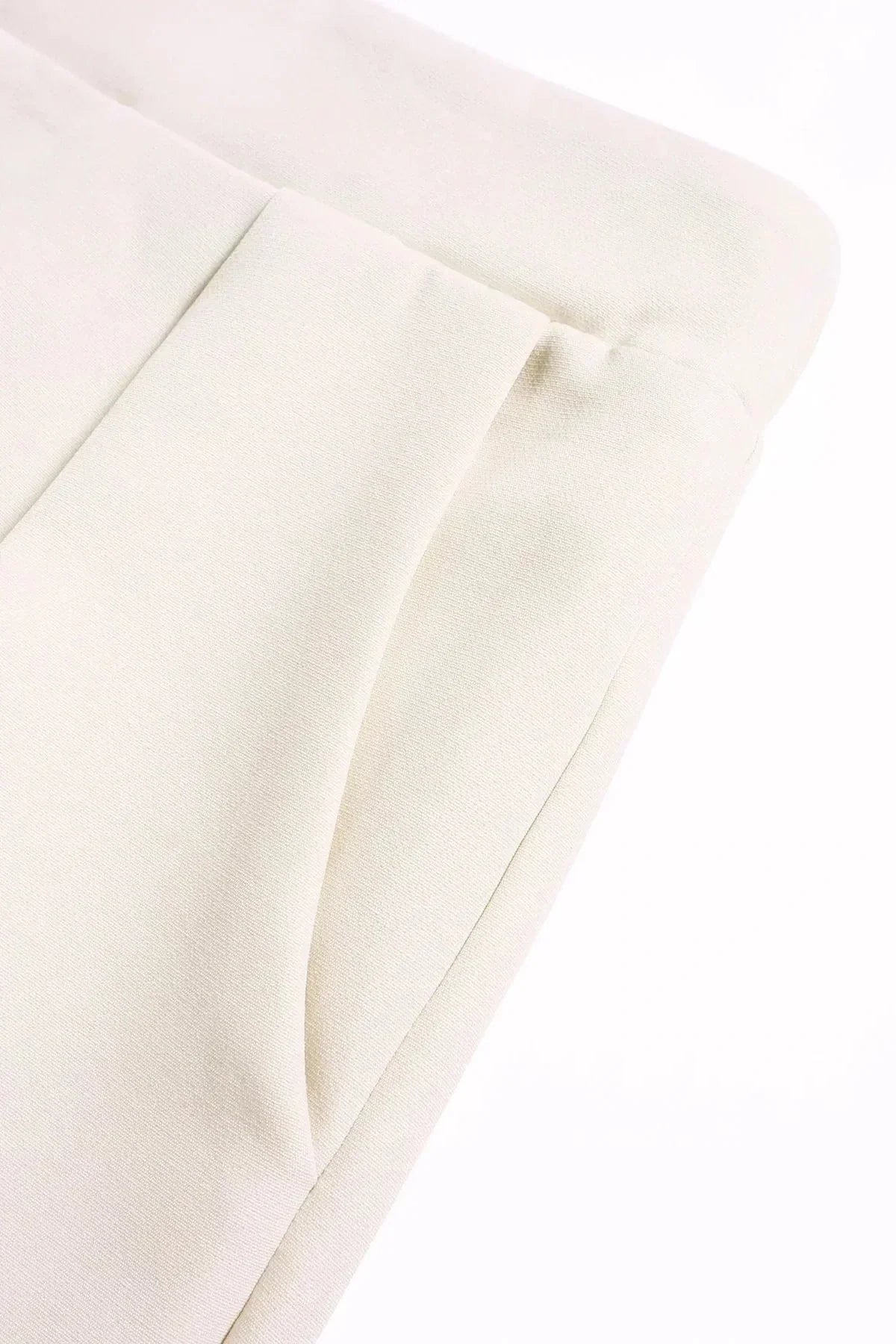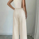 Birgitte | Dragt forener tidløs skræddersyn med moderne selvtillid. Sættet består af en robust ærmeløs vest med dekorative knapper og brede bukser, der sammen skaber en strømlinet, flatterende silhuet i en kremfarvet palette. Bellagio-præcision og omtanke for detaljer afspejler håndværk, kvalitet og en tidløs tilgang til design.