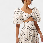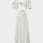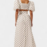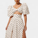 Ditte | Sæt udstråler tidløs elegance og en legende attitude. Sherine-designet tilfører et flirtende præg til både dag- og aftenlooks og forener feminin appel med et moderne snit. Det klassiske polkadot-mønster, de elegante pufærmer og den højt liv nederdel med frontslids skaber en sofistikeret balance mellem stil og komfort. Silhuetten er kropsnær med let stretch, og den diskrete bagpå lynlås giver et leje, sammenhængende look, der kan bæres efter år og bevare sin elegante karakter.