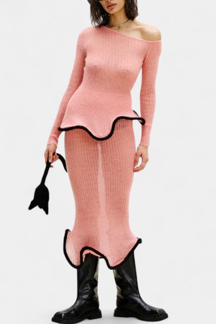 Emma | Langærmet Stormi er en sofistikeret sammensætning, der forener femininitet og mod i en ligefremt elegant balance. Den ribstrikkede overdel kysser én skulder, mens det halvtransparente midi-skørt skaber en legende, raffineret silhuet. Hvert materiale og hver søm vidner om håndværkets præcision og omtanke; en diskret spejlfinish tilføjer lysende raffinement og taler til modellens oprindelseshistorie og tidløse kvalitet. Den lyserøde nuance til fører varme og modernitet, og Stormi fremstår som et tidløst objekt for den bevidste garderobe og for samlere, der søger sjældne, veludførte stykker. Med begrænset oplag og udvalgte materialer repræsenterer Stormi en investeringsværdi, der taler til moderne stil gennem sæsoner og årstal.