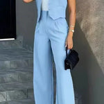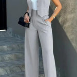 - Silhuet og pasform – Vestens taljefremhævelse og brede bukser skaber en afbalanceret, flatterende silhouette.