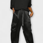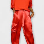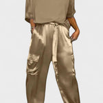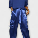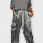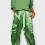 Ida | Silke sæt er et udtryk for uovertruffen komfort og en forfinet silhuet. Dette to-delte sæt i ægte silkestof glider let mod huden og giver et præsentabelt look, både derhjemme, på kontoret og til aftenarrangementer. Hver søm vidner om omhyggeligt håndværk, mens stoffets naturlige glans tilføjer en diskret luksus, der varer ved. Sættet kombineret tidløs elegance med praktisk anvendelighed og understreger en arv af kvalitet og omtanke. En klassiker, der henvender sig til samlere og dem, der sætter pris på langtidsholdbar stil.