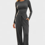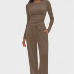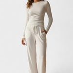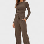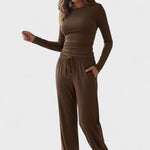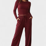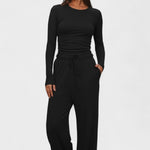 Fremstillet af blødt og åndbart stof, der giver lethed, fri bevægelse og en behagelig følelse hele dagen. Den løse pasform med lange ærmer og brede bukser skaber en moderne, afslappet silhuet – ideel både til hygge derhjemme og et stilfuldt hverdagslook.