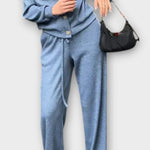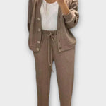 - Pasform og silhuet: Lige bukser skaber en ren, afslappet men slank silhuet; jakken i et klassisk snit tilføjer elegance.