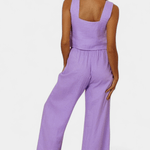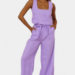 • Design: Ærmeløs top med fremhævet firkantet halsudskæring og brede, let faldende bukser.