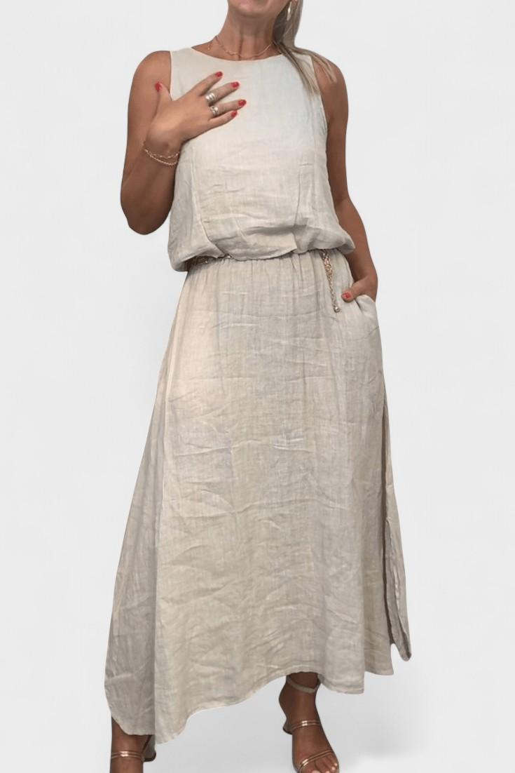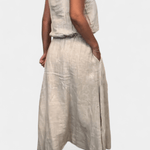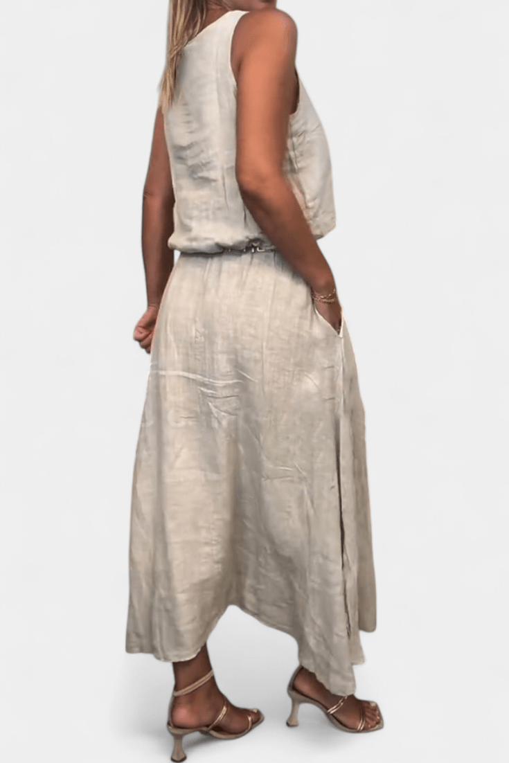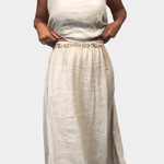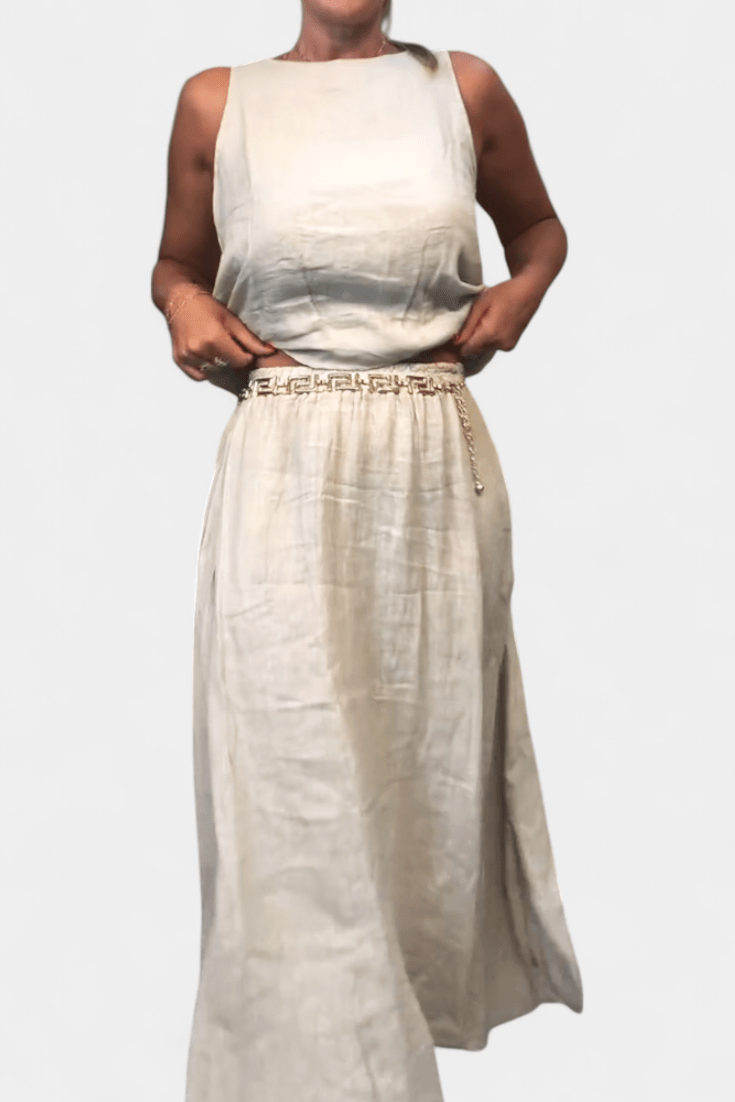 Meliora | Sæt udstråler tidløs elegance og en diskret luksus, der taler til den forskellige værdi. Sættet forener sommerens essens i en afslappet, men sofistikeret silhuet bestående af en løs vest uden ærmer og en lang, draperet nederdel med sidelommer. Lin- og bomuldsstoffet ånder og udvikler en naturlig glans over tid, mens håndværket og oprindelsen tydeligt afspejles i hver detalje. Produktion foregår i små partier med omtanke, hvilket understreger sætets eksklusivitet og langtidsholdbarhed. Meliora | Sæt tilbyder et tidsløst sommerlook med langvarig værdi og samlerværdi — ideelt for strand, ved og sociale begivenheder, og let at blande til en sofistikeret, æstetisk stil. Sættet 'Meliora | Sæt' er derfor ikke kun en beklædningsgenstand, men en investering i tidløs håndværkskunst, der giver glæde sæson efter sæson.