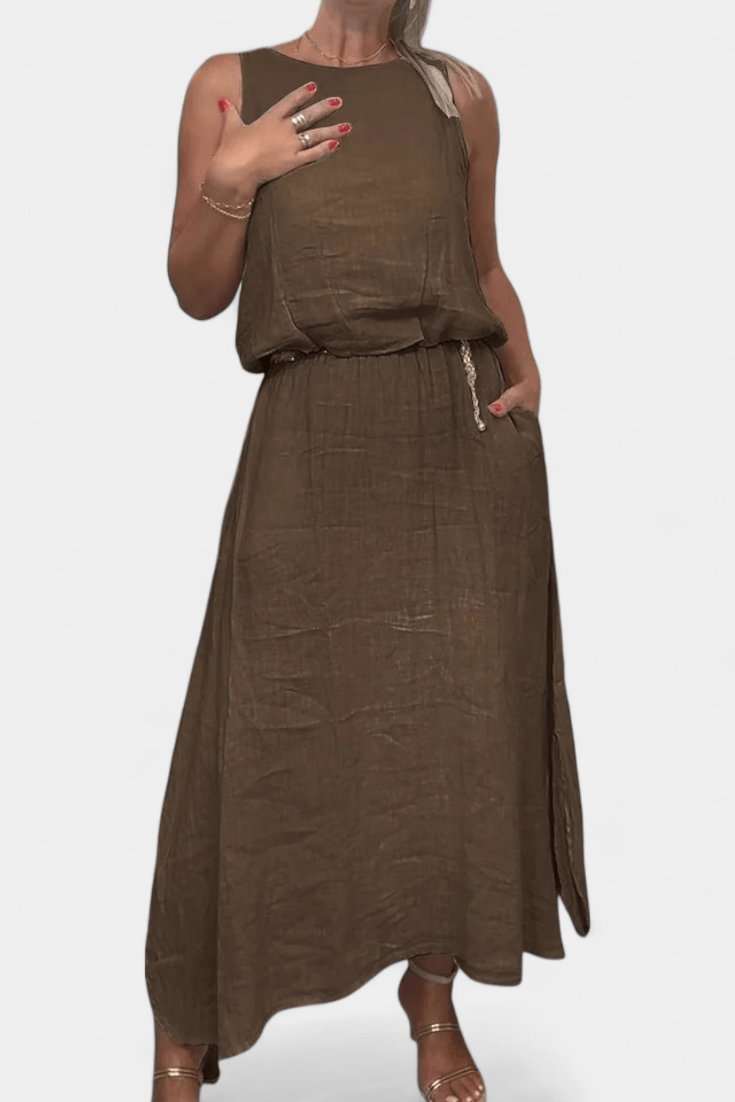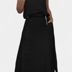 • Silhuet og detaljer: En løs vest uden ærmer og en lang, draperet nederdel med sidelommer til diskret funktion.