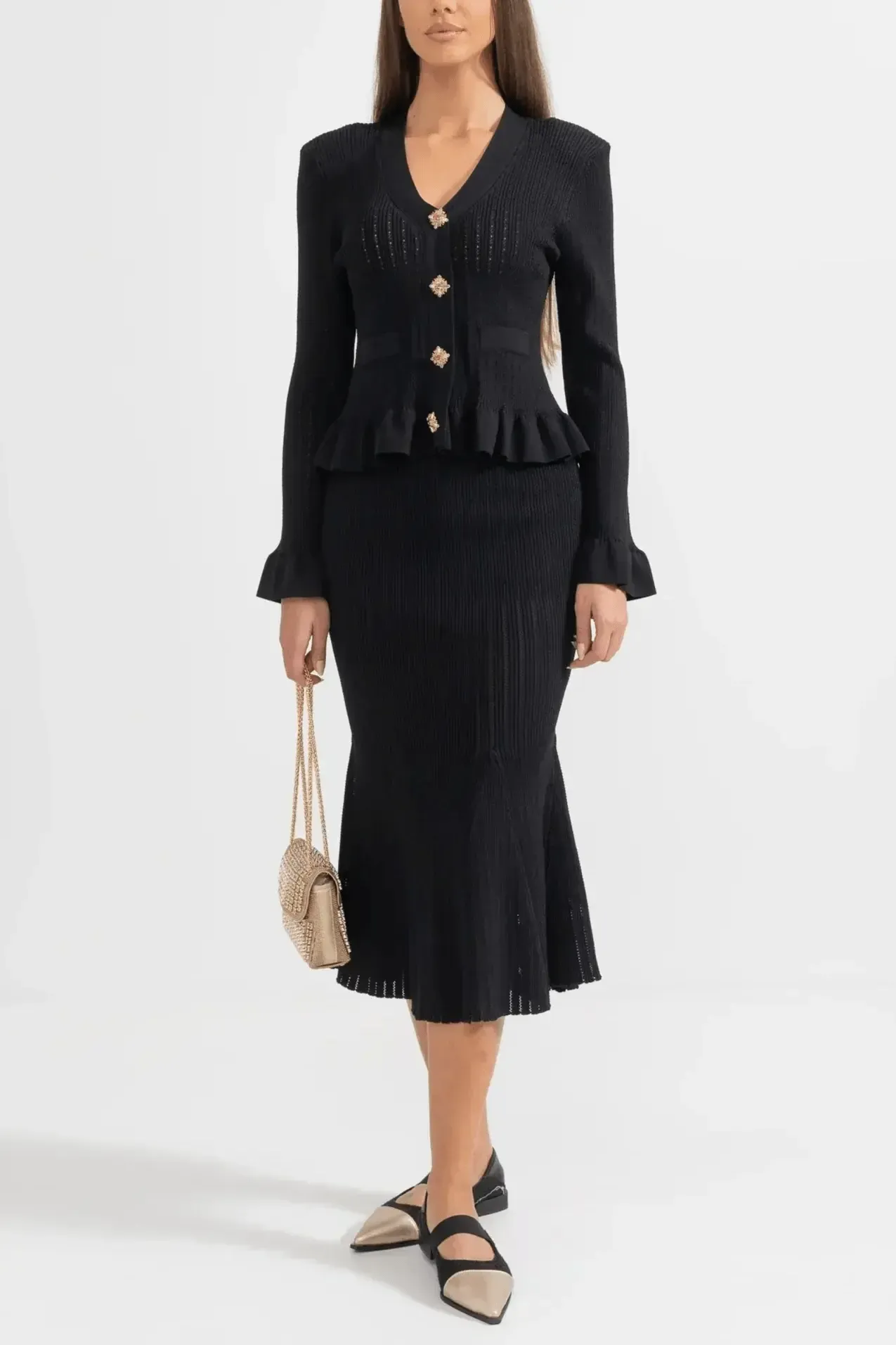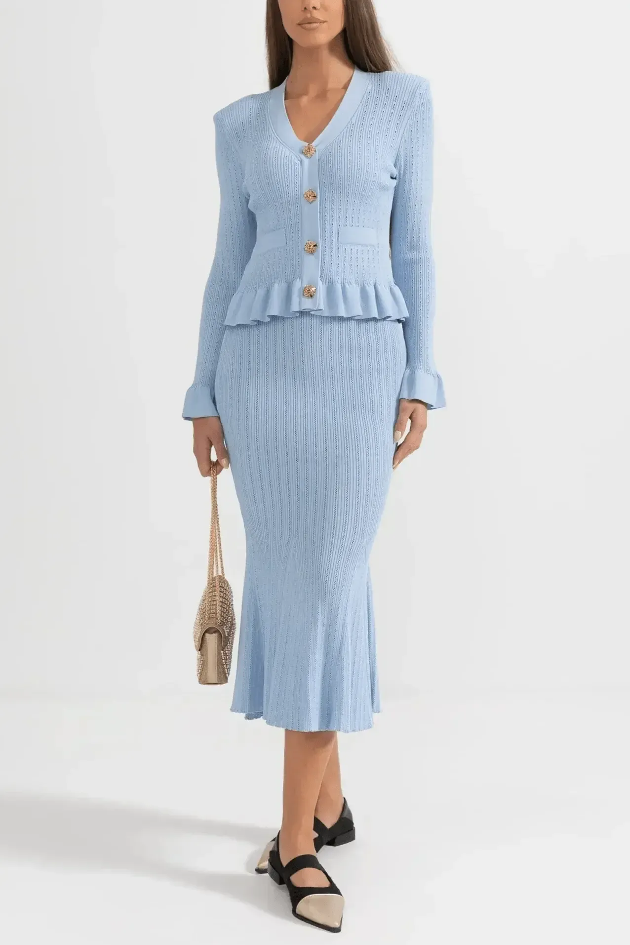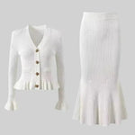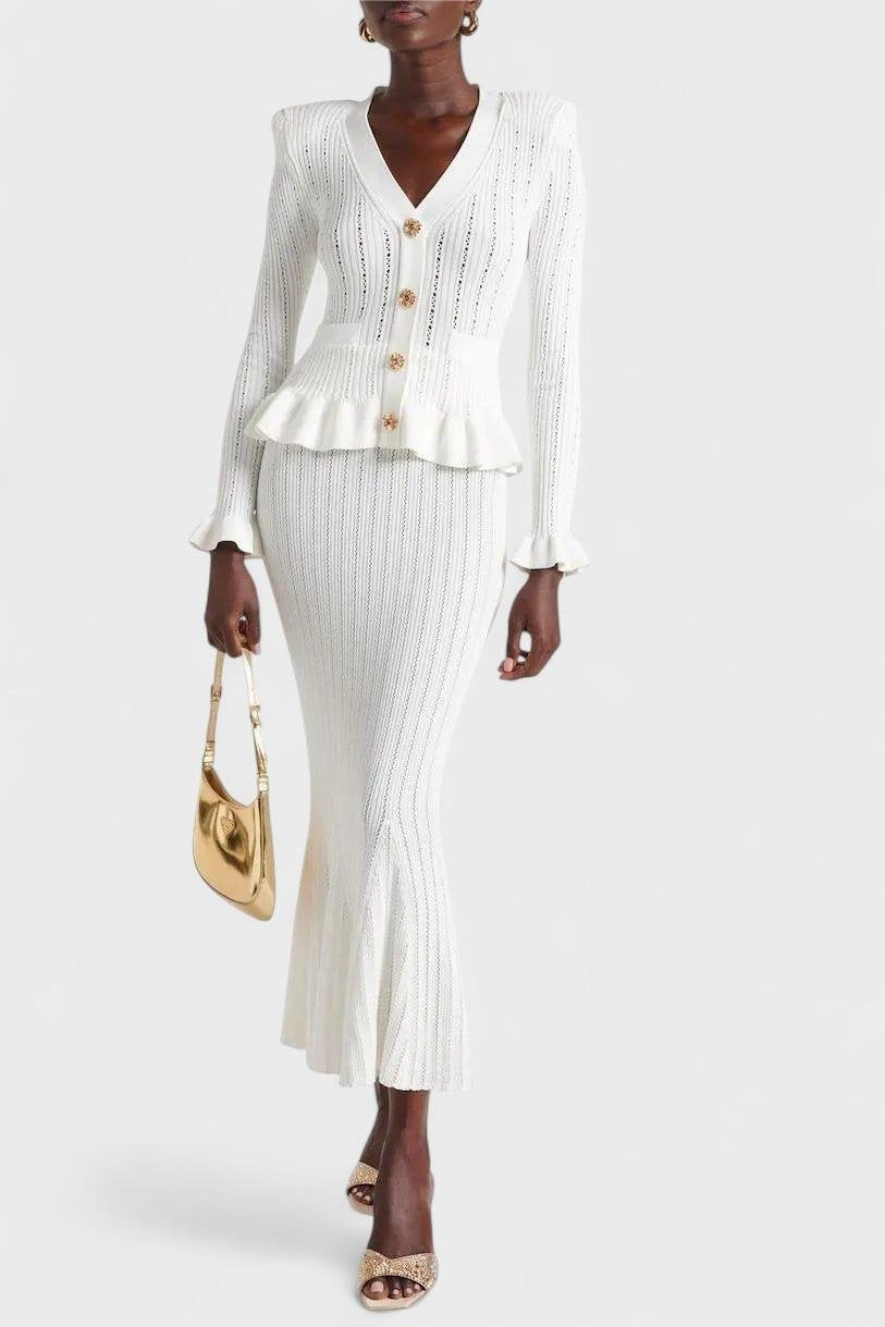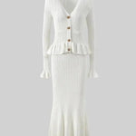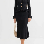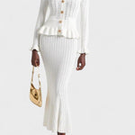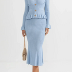 Forsigtighed | Sæt udstråler tidløs elegance og mærkets stolte arv gennem hvert snit. Sættet består af en figursyet V-hals cardigan med sarte flæser ved ærmerne og vintage-inspirerede knapper sammen med en højtsiddende A-line midi-nederdel, alt sammen i førsteklasses garn og udført med minutiøs syning. Den bløde, åndbare konstruktion giver komfort hele dagen, mens de velovervejede detaljer og den elegante snit sikrer en sofistikeret silhuet, der nemt går fra afslappet til formel. Med begrænset tilgængelig tilbyder Prudence | Sæt en ægte samlerappel og en tidløs investering i garderoben, der holder år efter år. Højt liv og A-line snit giver en tidløs, flatterende silhuet, der holder år efter år.