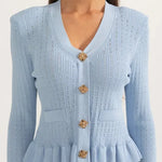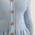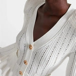 - Figursyet V-hals cardigan med sarte flæser og vintage-inspirerede knapper, der understreger en sofistikeret stil.