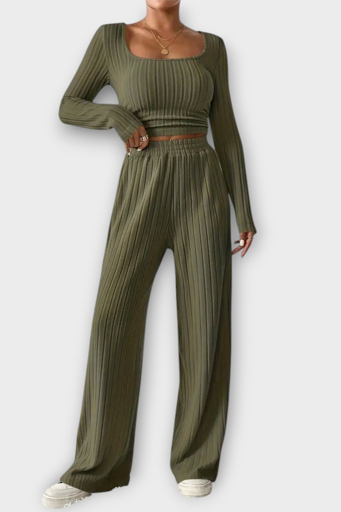 - Silhuet og pasform: Langærmet top og høj talje skaber en moderne, komfortabel pasform, der flatterer mange kropsfigurer.