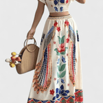 Thilde | Boho sæt udstråler let luksus og tidsløs stil gennem bohemisk formsprog og håndværksmæssig præcision. Itzel-inspirationen skaber en skulpturel kort top i smocket snit, harmonisk med en løs, flagrende nederdel, der bevæger sig i vinden. Etnisk mønster med påfugle og blomster i symmetrisk design og delikate fjæredetaljer giver sat en kunstnerisk, moderne flair uden at gå på kompromis med subtiliteten. Omhyggeligt udvalgte materialer og små partier sikrer lang levetid og eksklusivitet, som passer til ferier og særlige arrangementer. Tilgængeligt i begrænset antal — en tidløs samlergenstand, der tilfører garderoben elegance og lang levetid. Håndværket står tydeligt i hvert søm og hvert mønster og giver en følelse af arv.