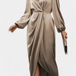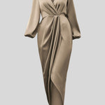 Inger | Maxi kjolen inviterer til nattens elegance gennem et flydende, let glansfuldt stof, der falder som silke. Den dybe V-hals fremhæver dekolletten med diskret drama, mens pufærmer og den rynkede talje skaber en sofistikeret silhuet i bevægelse. Sidesplitten tilfører et moderne præg uden at ofre kjolens tidsløse poesi, og hvert sting vidner om håndværkets omhyggelighed. Med fokus på oprindelse, arv og langtidsholdbar kvalitet er Inger designet til at være gennem sæsoner og blive en ægte samlerappel.