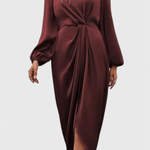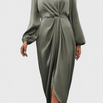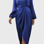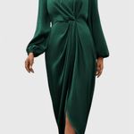 • Silhuet og detaljer: Dyb V-hals, pufærmer og rynket talje skaber en sofistikeret, naturlig form i bevægelse.