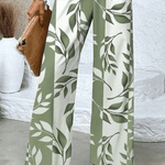 - Farve og mønster: Olivengrøn top med rolig tekstur; bladprintede hvide bukser for subtil bevægelse.