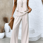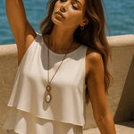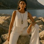 Malou | Strandglød sæt udstråler tidløs kystnær luksus med en luftig silhuet og ubesværet stil. Sættet består af en blød to-lags top med drapering og brede bukser, der falder elegant og flatterer enhver figur. Den creme-neutrale nuanceharmonerer med solbrun hud, gyldne smykker og dine yndlingssandaler og skaber et sofistikeret look uden besvær. Gennemarbejdede snit og let konstruktion giver bevægelsesfrihed og rolig selvtilid i enhver anledning. Malou signalerer håndværk og omtanke i hver detalje og afspejler strandlivets krav til kvalitetsfølelse. Med sin alsidighed kan sætte bæres samlet eller separat, hvilket giver tidløse stylingmuligheder til middag ved havet, gåture og brunch — og er let at pakke til ferie og weekendture. Begrænset antal enheder fremhæver sætets eksklusivitet og gør Malou til en varig investering.