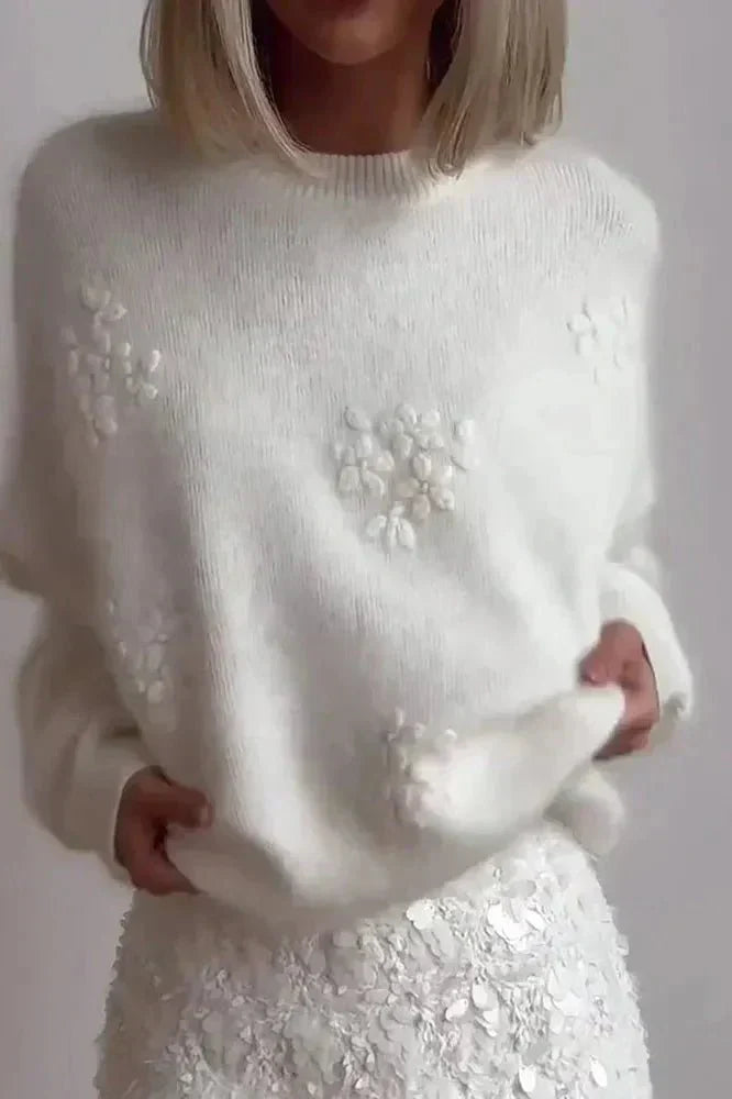 Tanja | Elegant Striktrøje er et udtryk for Zariahs arv af håndværk og materialekvalitet. Den lumenhvide trøje har et let, silkeagtigt fald og en blød, børstet overflade, der ligger tæt mod huden og giver varme uden at være tung. Subtile blomsterdetaljer tilføjer feminin elegance uden at dominere, hvilket gør trøjen til et tidløst stykke til særlige begivenheder og kølige aftener ved pejsen. Den rene silhuet falder smukt over kroppen og signalerer omtanke for detaljer, der tiltaler samler- og kvalitetsbevidste kunder. Den neutrale palet i blød hvid og sølvgrå gør den let at style med skræddersyede nederdele eller bukser samt med mere afslappede looks. Perfekt som en garderobeinvestering med lang levetid, der kan overleveres gennem generationer og giver tidløs værdi i enhver samling.