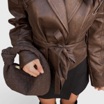 Trine | Kompakt taske fanger og luksuriøs mokkalignende overflade, vævede detaljer og et skulpturelt knude-ornement. Den er designet til at supplere både afslappede og aftenlooks og bringer varme, karakter og tidløs elegance i en kompakt silhuet, hvor det bløde taktile spil og dybden fra den vævede tekst gør den til en raffineret følgesvend gennem sæsonen. Bevidst håndværk møder nordisk designarv og moderne elegance og giver en værdi, der varer; hver detalje gennemgår omhyggelig finish og materialekontrol. Begrænset produktion sikrer eksklusivitet og tidløs samlerværdi.