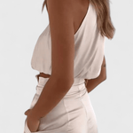 - Design og silhuet: Draperet, ærmerløs top og vide bukser skaber en afslappet, feminin signatur.
