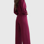 - Silhuet og bevægelse: V-hals, lange ærmer og brede bukseben skaber en balanceret, elegant silhuet med drapering og bevægelsesfrihed.