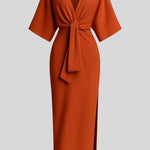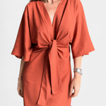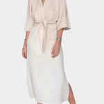 Astrid er en elegant midi-kjole fra Ainhoa™, hvor en dyb V-hals, kimonoærmer og en markant frontknude mødes i en raffineret, tidløs silhuet. Den strukturerede, bløde stofkvalitet sikrer en præcis pasform og en løftende drapering, der fremhæver taljen uden at gå på kompromis med komforten. Hver detalje vidner om håndværkets omhu og materialernes nøje udvælgelse, hvilket skaber et stykke tøj, der føles som en arv snarere end en trend. Med begrænset tilgængelighed fremstår Astrid som en investeringskjole, der kombinerer tidløs elegance med samlerappel og en bæredygtig værdi i garderoben.