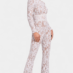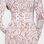Augusta | Jumpsuit er et udsøgt symbol på tidløs luksus og håndværksmæssig omhu. Den samler sensuelt, sofistikeret design med en delikat broderet blonde og palietter, der pryder en let gennemskuelig bund og leger med lys og skygge. Den lange, kropsnære pasform fuldender silhuetten, mens det brede korsettbælte tilføjer struktur og en markant talje. Hver sting vidner om provenance og begrænset tilgængelighed, hvilket gør jumpsuit’en til en investering i eksklusivitet og langtidsholdbar elegance.