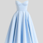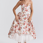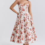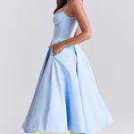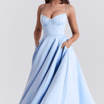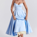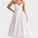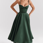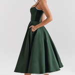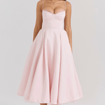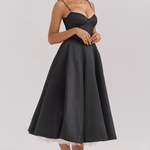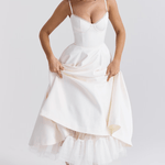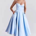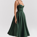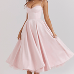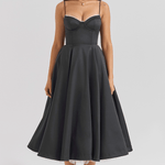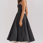 - Silhuet og drapering: Tidløs midikjole med klassisk snit og draperet fald, der flatterer i bevægelse.