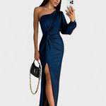 - Siluet og komfort: Én skulder, sculptural linjeføring og sidesplit giver bevægelsesfrihed uden kompromis.