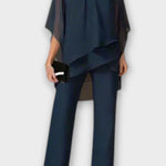 - Silhuet og design: Asymmetrisk top fremhæver skulder og talje, mens lige bukser forlænger silhuetten med diskret elegance.