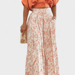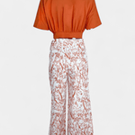 - Silhuet og bevægelse: V-hals-toppen flatterer feminine konturer, mens de brede ben skaber en let, flydende silhuet.
