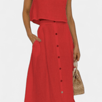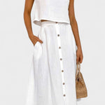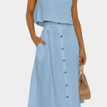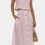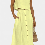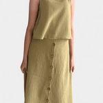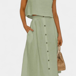Maja | Blødt sæt udstråler diskret luksus og tidløs kvalitet gennem en minimalistisk, håndværksmæssigt overvejet tilgang. Det lette bomuldsmateriale føles blødt mod huden, og den åndbare pasform sikrer komfort hele dagen. Den centralt placerede knaplukning skaber illusionen af en længere silhuet, mens det rene, ærmeløse snit tilfører moderne lethed. Nederdelen i midi-længde med funktionelle lommer og luftig lægning bevæger sig med dig og giver sættet en naturlig alsidighed til hverdagen eller byens sofistikerede øjeblikke. Produceret i et begrænset oplag giver Maja en diskret eksklusivitet og samlerappel.