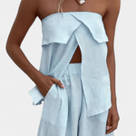 Oriana |Sæt udstråler raffineret sommerlig elegance og tidløs selvsikkerhed. Dette set forener en tætsiddende bandeau-top uden stropper med en lang nederdel med sidesplit og skaber en strømlinet silhuet, der glider gennem sommerdage og byliv. Designet fremhæver kroppen diskret gennem let, ensfarvet stof og gennemført omtanke i hvert snit, hvilket afspejler håndværkets kvalitet. Oriana |Sæt fungerer som en tidløs garderobeinvestering, der kombinerer raffinement, komfort og lang levetid – ideel til rejser, marinaftener og byens pauser, hvor subtil luksus møder praktisk elegance.