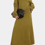 - Silhuet og snit – Toppen har høj krave og lange ærmer med sideåbninger; maxi-nederdelen følger med formskåret talje og let fald.