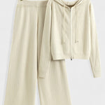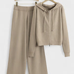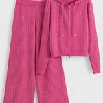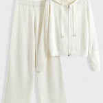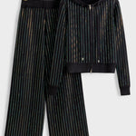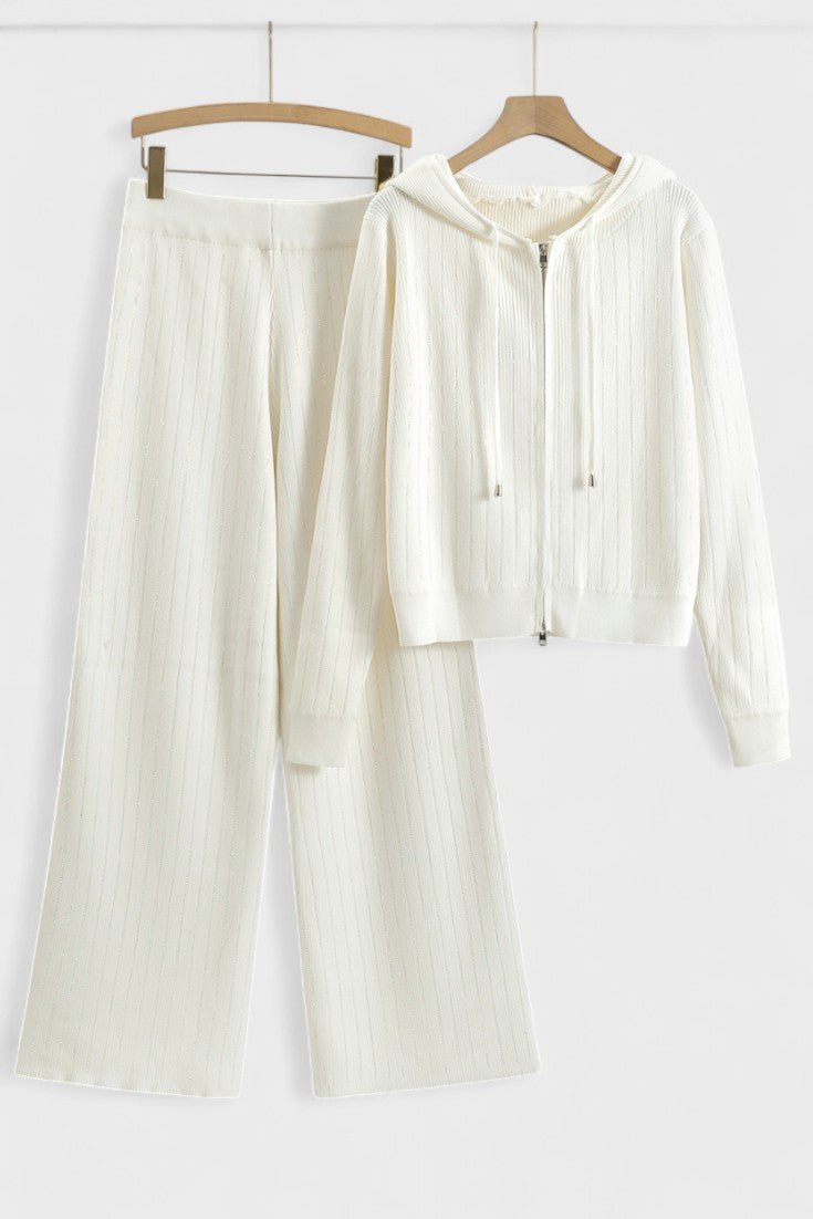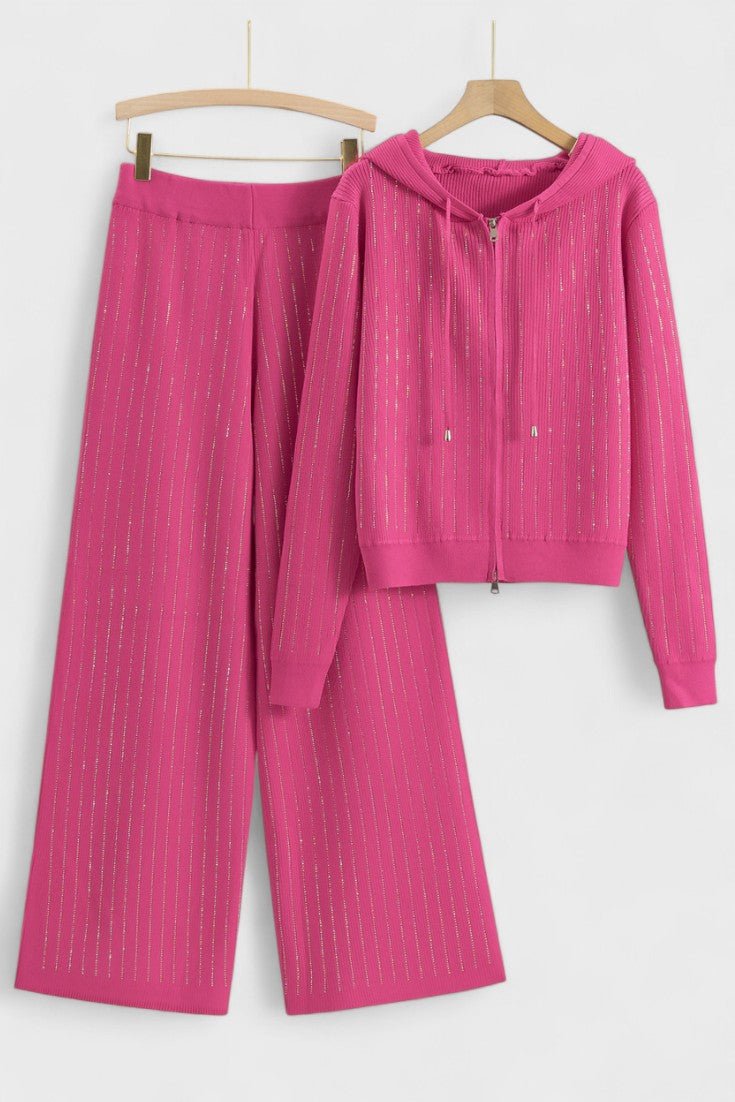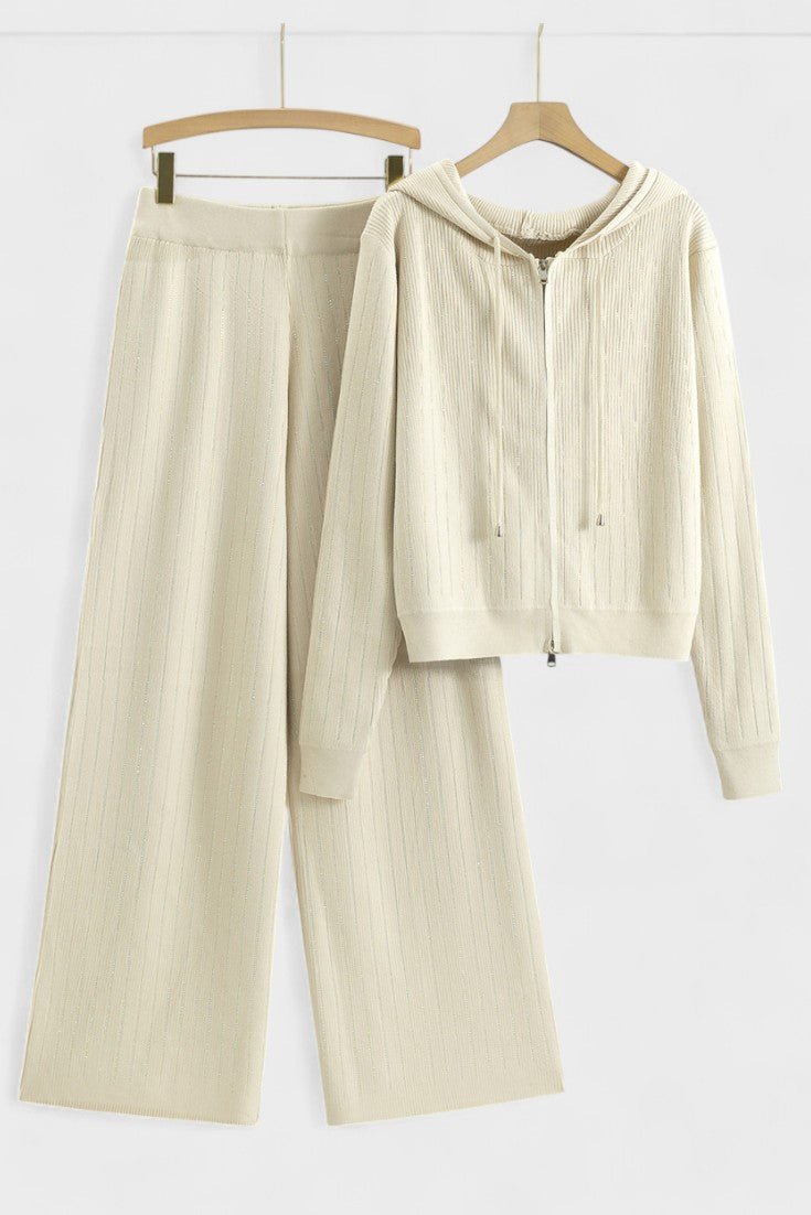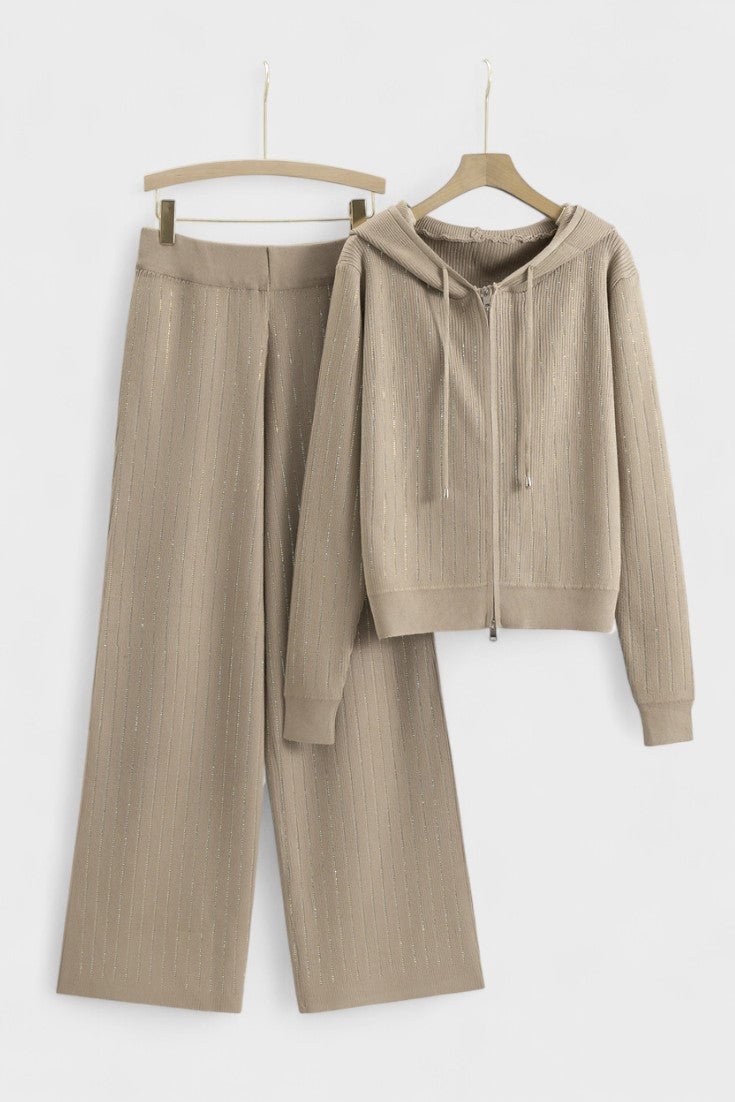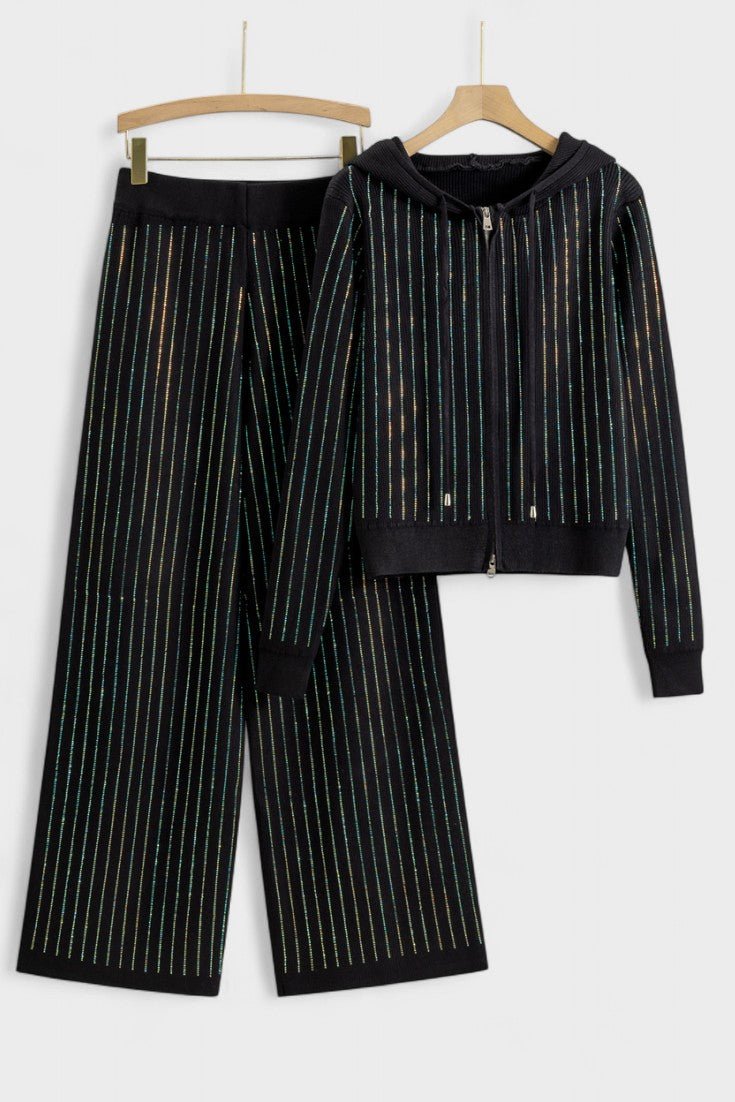 - Design og detaljer: To-delt sæt bestående af hættetrøje og brede bukser med diskrete strassdetaljer, der fanger lyset i bevægelse.