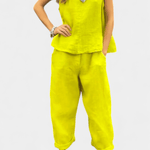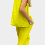 - Snit & pasform: Lige vest med lukket halsudskæring og markant fald; afslappede bukser med pressede ben sikrer let bevægelsesfrihed og tidløs elegance.