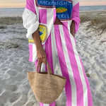 Gry | Candy Coast er et sofistikeret møde mellem retro-pop og moderne resort-stil. Dette to-delte sæt forener lyserøde og hvide striber med grafiske, kystinspirerede prints og udstråler en dristig, tidløs attitude. Den oversized top skaber en let, struktureret silhuet, mens højtaljede bukser forlanger silhuetten og tilføjer elegance i bevægelse. Materialerne er udvalgt med fokus på komfort og holdbarhed, og håndværket afspejler oprindelse og omtanke i hver detalje. Gry | Candy Coast er designet til at holde gennem sæsonerne uden at miste appel, hvilket gør den til en investering for samleren og en kilde til langvarig værdi i en garderobe præget af kvalitet og raffinement. Gry | Candy Coast står som bevis på bæredygtig design og en langtidsholdbar investeringsværdi. Begrænset tilgængelighed forstærker eksklusiviteten og den tidsløse appel.