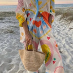 Solveig | Kærligheds sæt repræsenterer tidløs nordisk håndværk og sofistikeret design i en to-delt silhuet. Den lette, oversized top kombineret med rummelige brede bukser giver bevægelsesfrihed uden at gå på kompromis med elegance. De grafiske motiver – hjerter, stjerner og penselstrøg i klare farver – udstråler legende raffinement og en tidløs grafik, der gør sættet til en ikonisk investering i garderoben. Med fokus på materialer og finish signalerer Solveig en premium kvalitet, der føles luksuriøs ved huden og holder sin appel sæson efter sæson. Perfekt til sommerdage, festivaler og fine hverdagsstunder, hvor komfort møder stil.