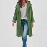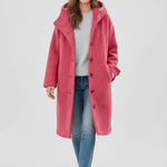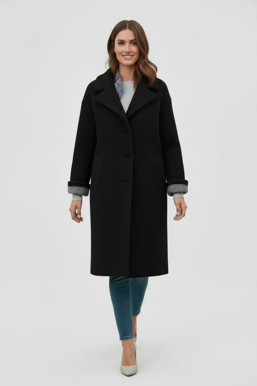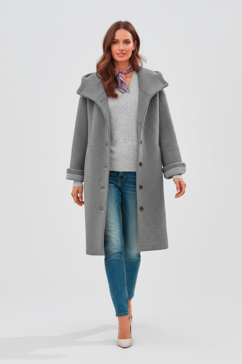 - Moderne og hyggeligt design : En løstsiddende frakke med høj krave og klassiske knapper, perfekt til et afslappet, men elegant look.